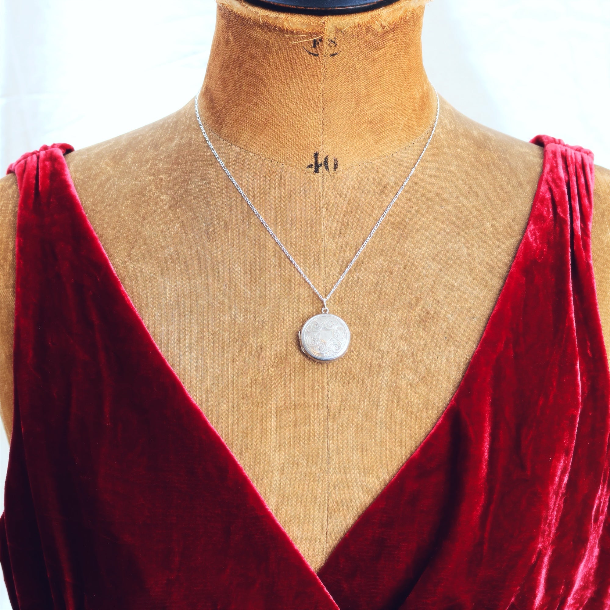 Circa 1940's, a vintage Silver locket; nicely rounded which feels comforting in the hand as we believe a locket should. It is lavishly hand engraved with scrolling naturalistic tendrils around a centre shield which could be personalised with an initial by our clever hand engraver.