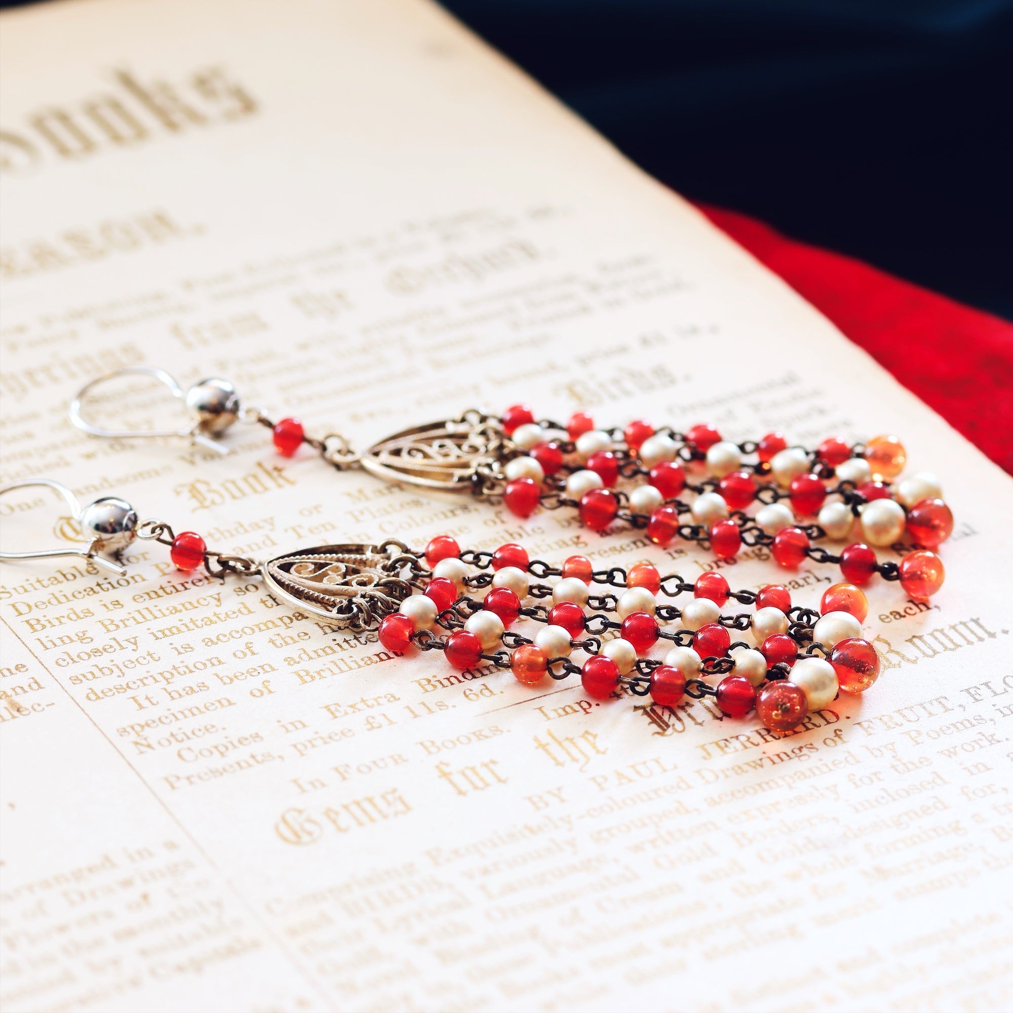 From the renowned Paris firm of Rousselet, this sought after pair of antique filigree faux Pearl and russet Glass chandelier earrings. Dating to the 1920's, they were made by hand in his factory which employed many women manufacturing high quality costume jewellery who were each trained as an apprentice for several years. Perfect for a vintage wedding, these sweet earrings are both delicate and impactful, being beautifully articulated as they move. In Silver, they measure 8cm from the top of the earwire.