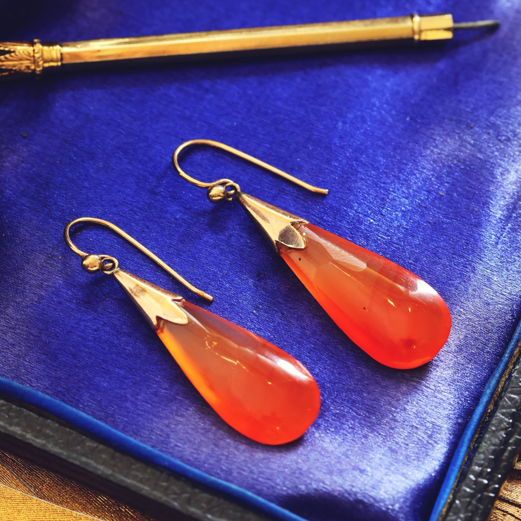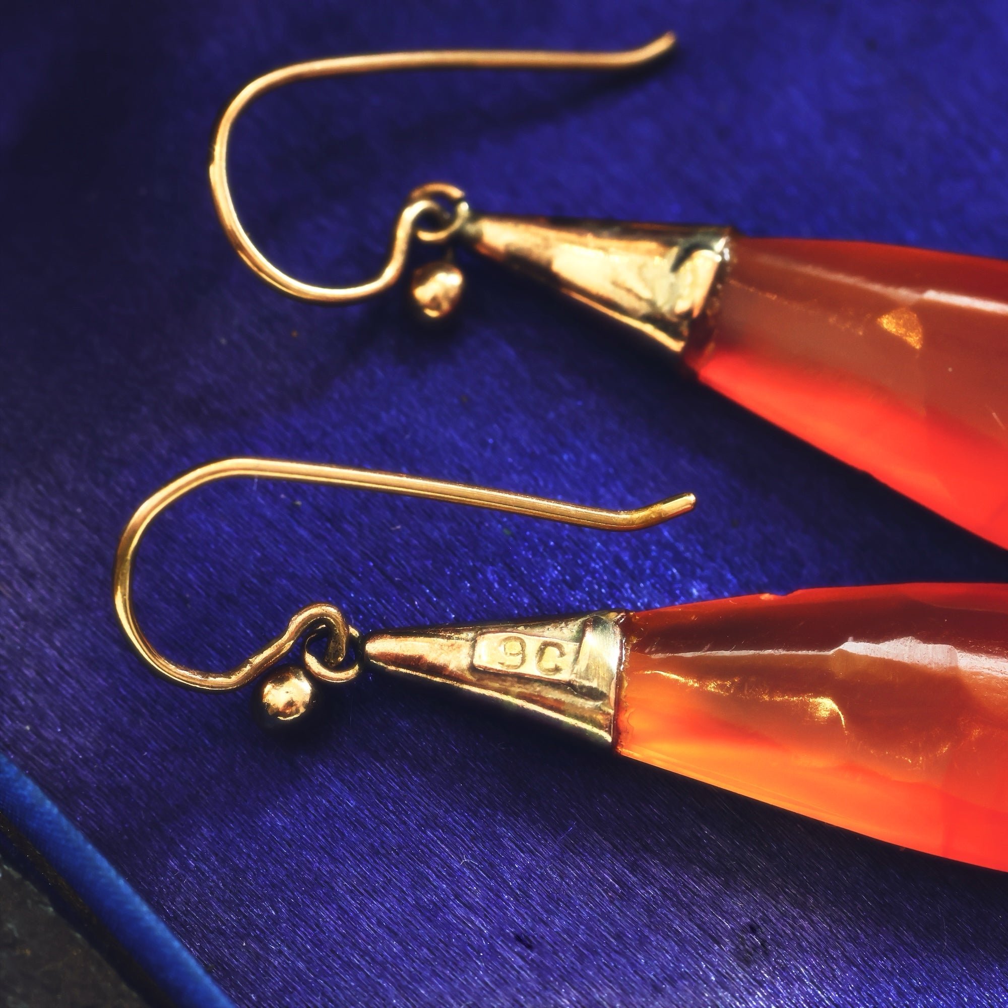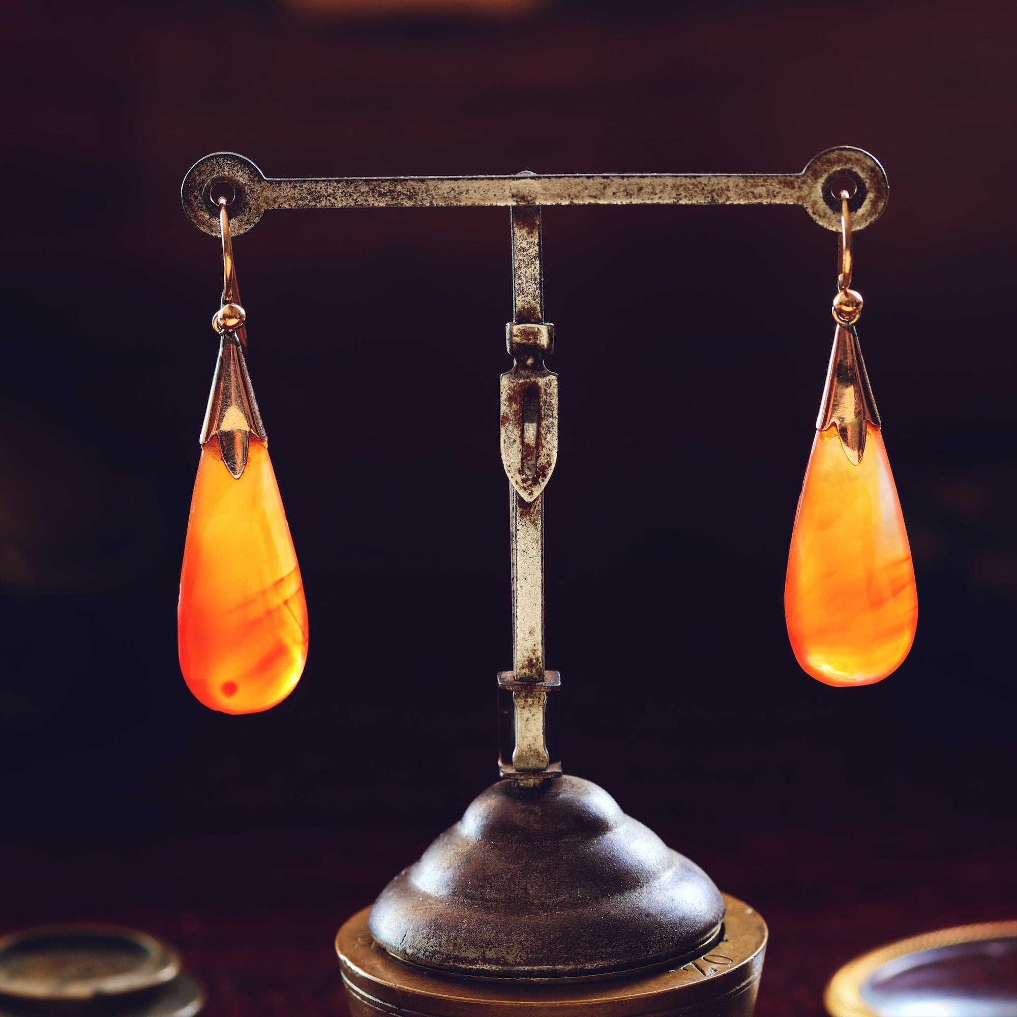 An elegant pair of vintage natural Carnelian drop earrings mounted in 9ct yellow Gold and cut to a harmonious shape, one can see in our images the beautiful banding within the stone which whirls as if fluid.. fascinating and beautifully handmade.