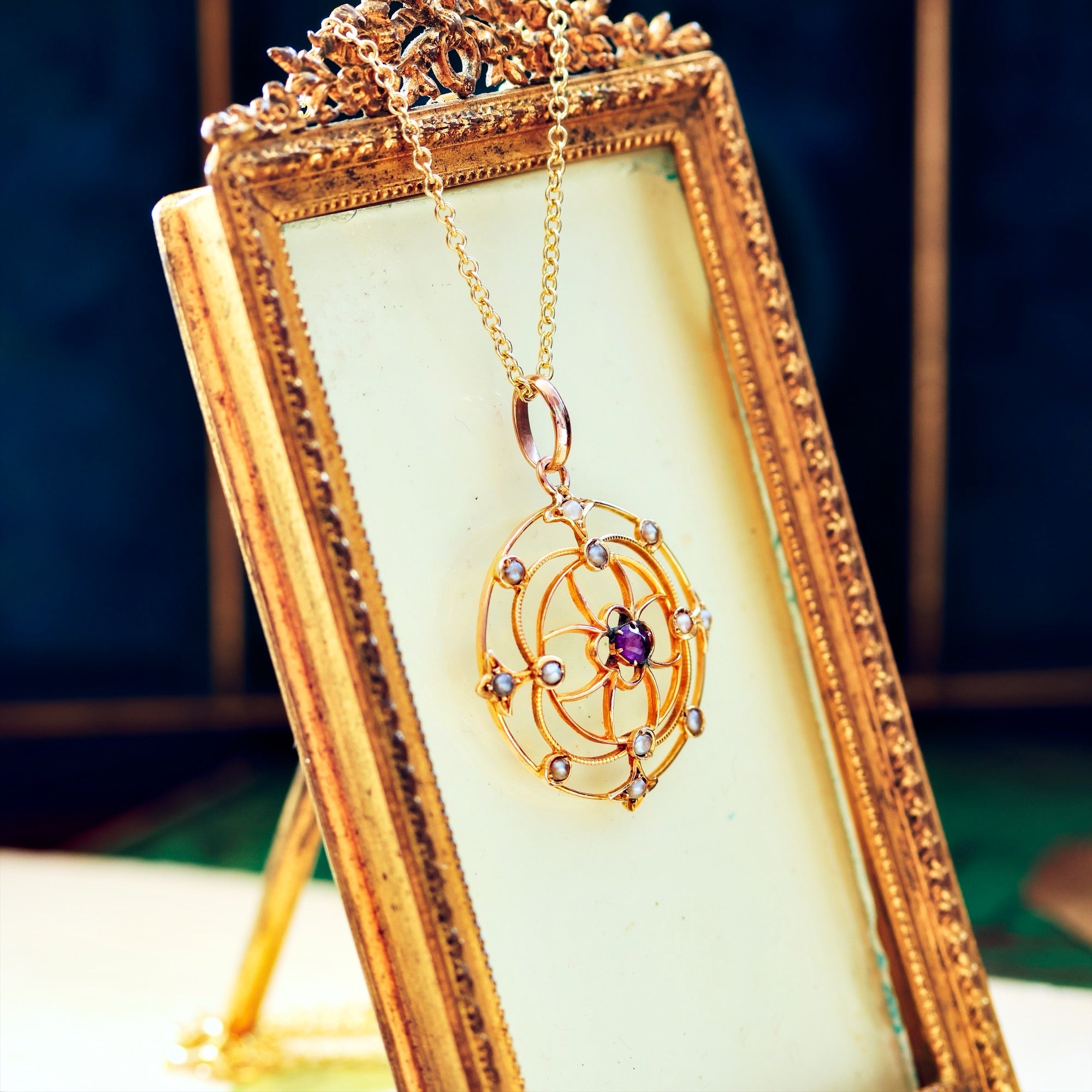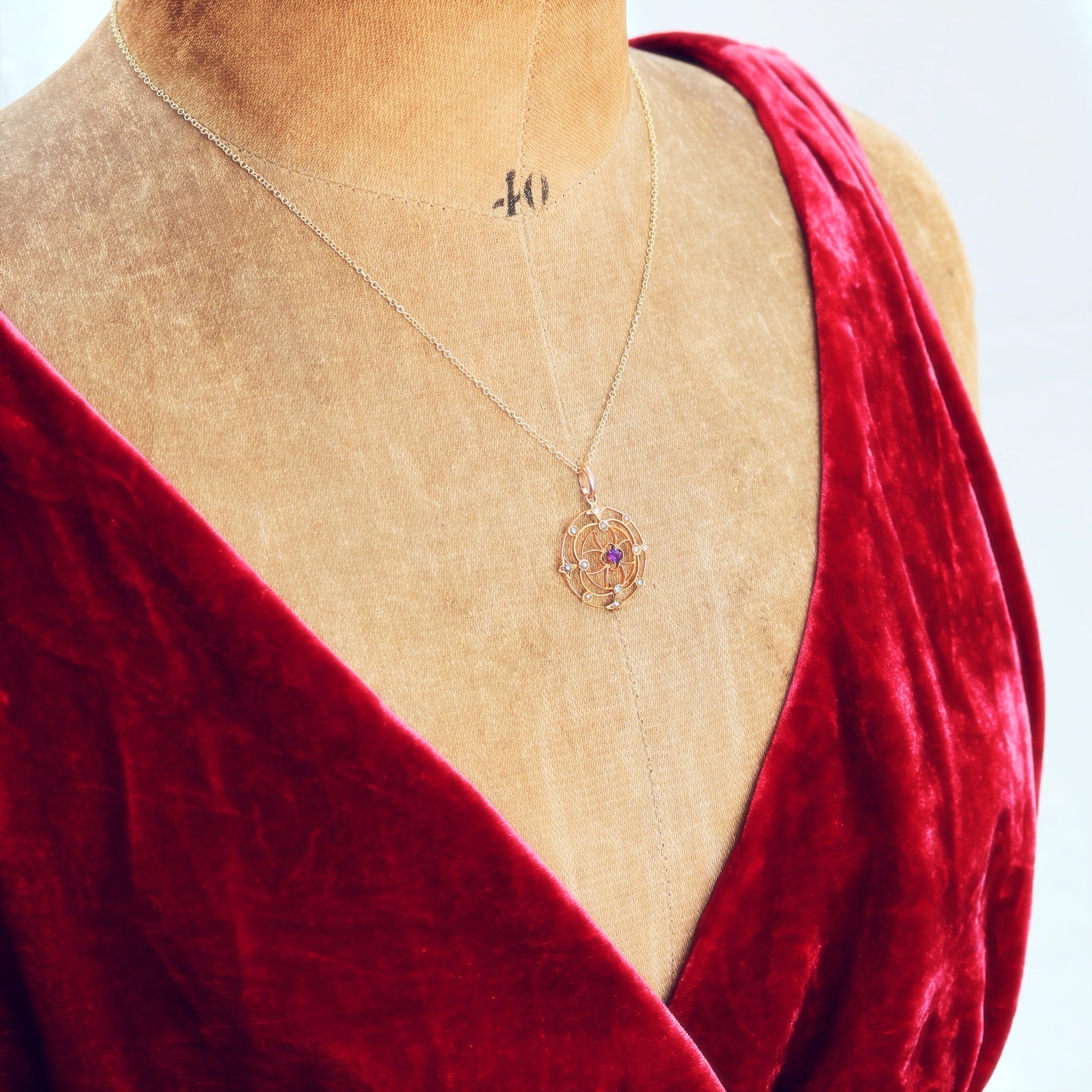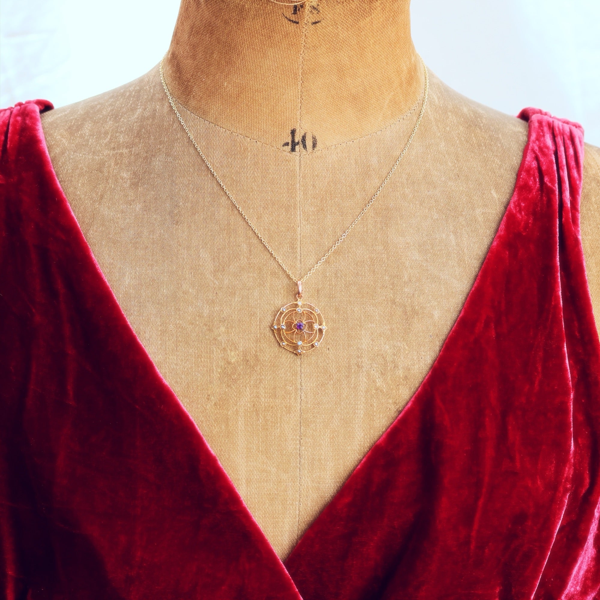 Circa 1900, an antique Arts & Crafts styled lavaliere pendant in the light and lovely mood which was much beloved. If you look to the reverse you'll see how the whole was hand crafted... Elements resembling a fine floralesque web are shaped in 9ct yellow Gold wire; each set with a leafy motif centered around a weeny purple Amethyst. Delightful! The whole exudes classic Edwardian elegance.