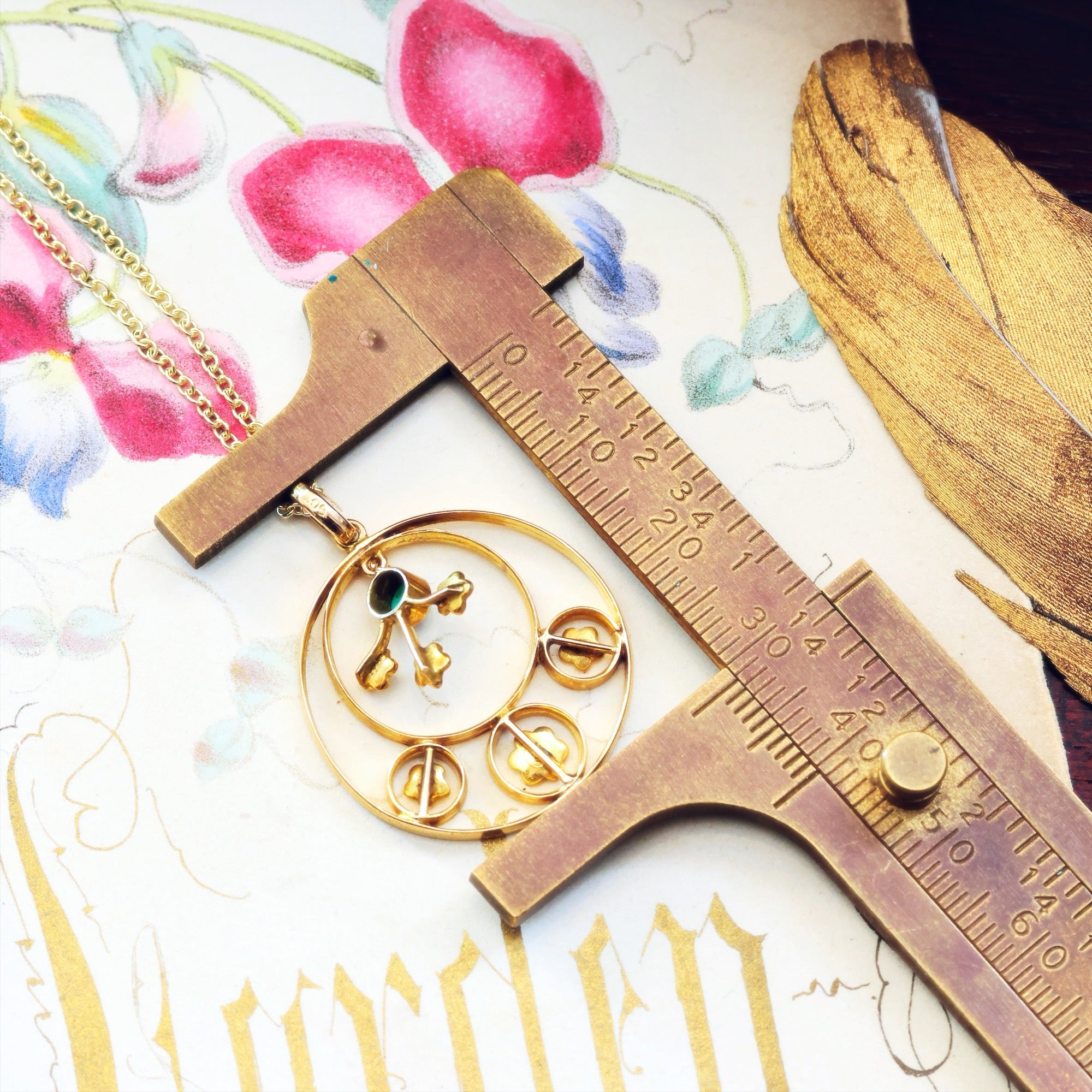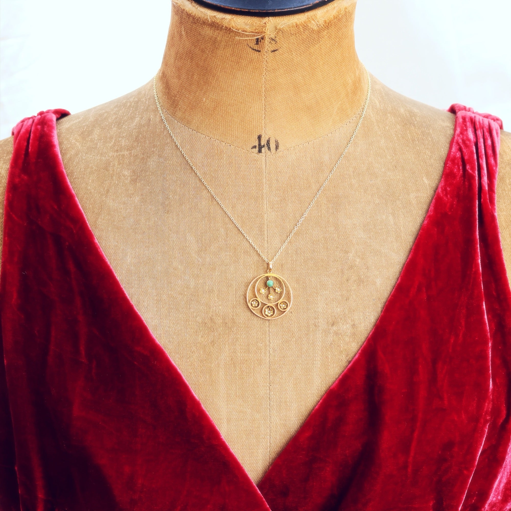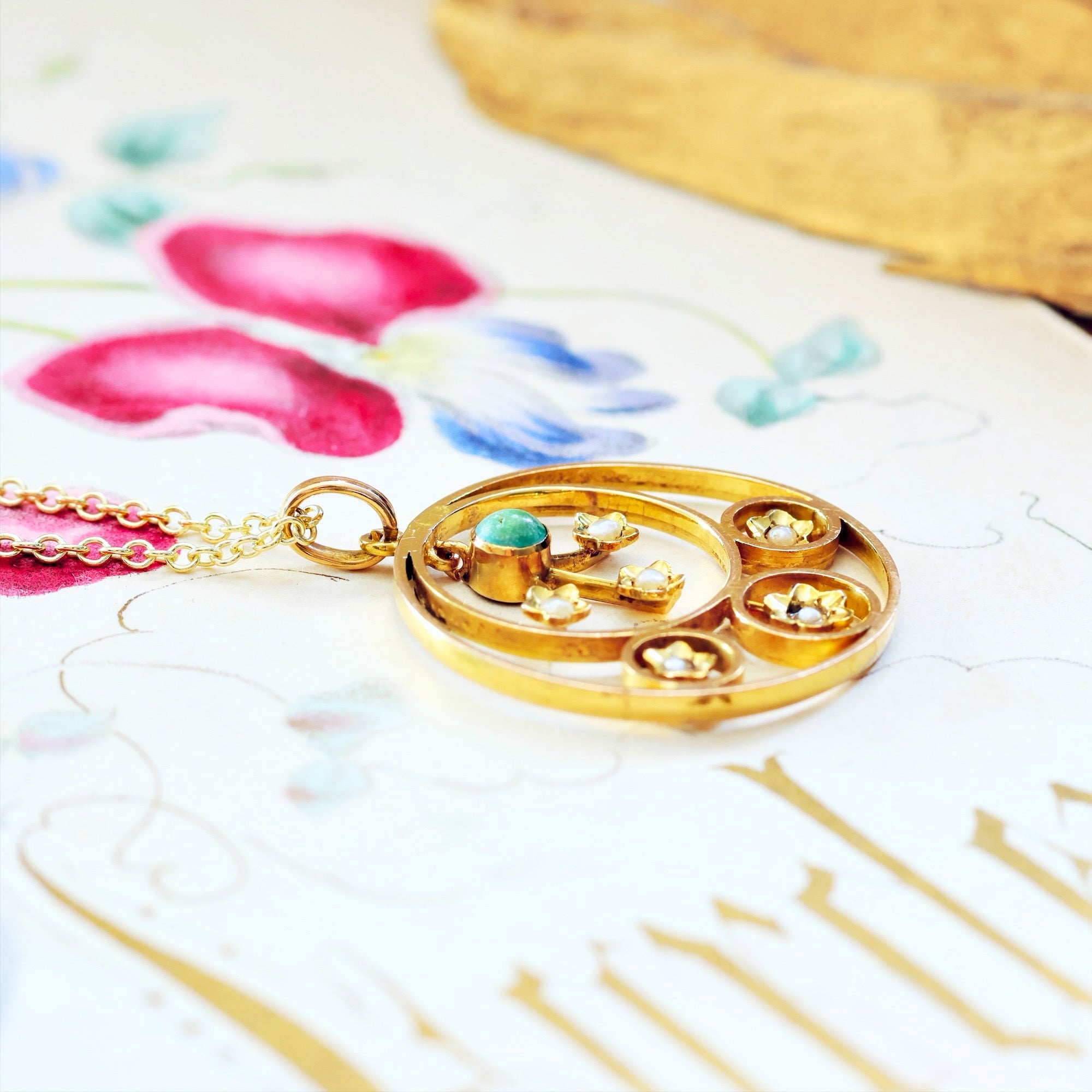 Circa 1900, an antique Arts & Crafts styled lavaliere pendant in the light and lovely mood which was much beloved. Circular elements are crafted in 9ct yellow Gold squared wire; all articulated and each set with a floral motif centered around a weeny natural Pearl; the largest holding a Turquoise as well. With an enchanting movement when worn, it exudes classic Edwardian elegance.