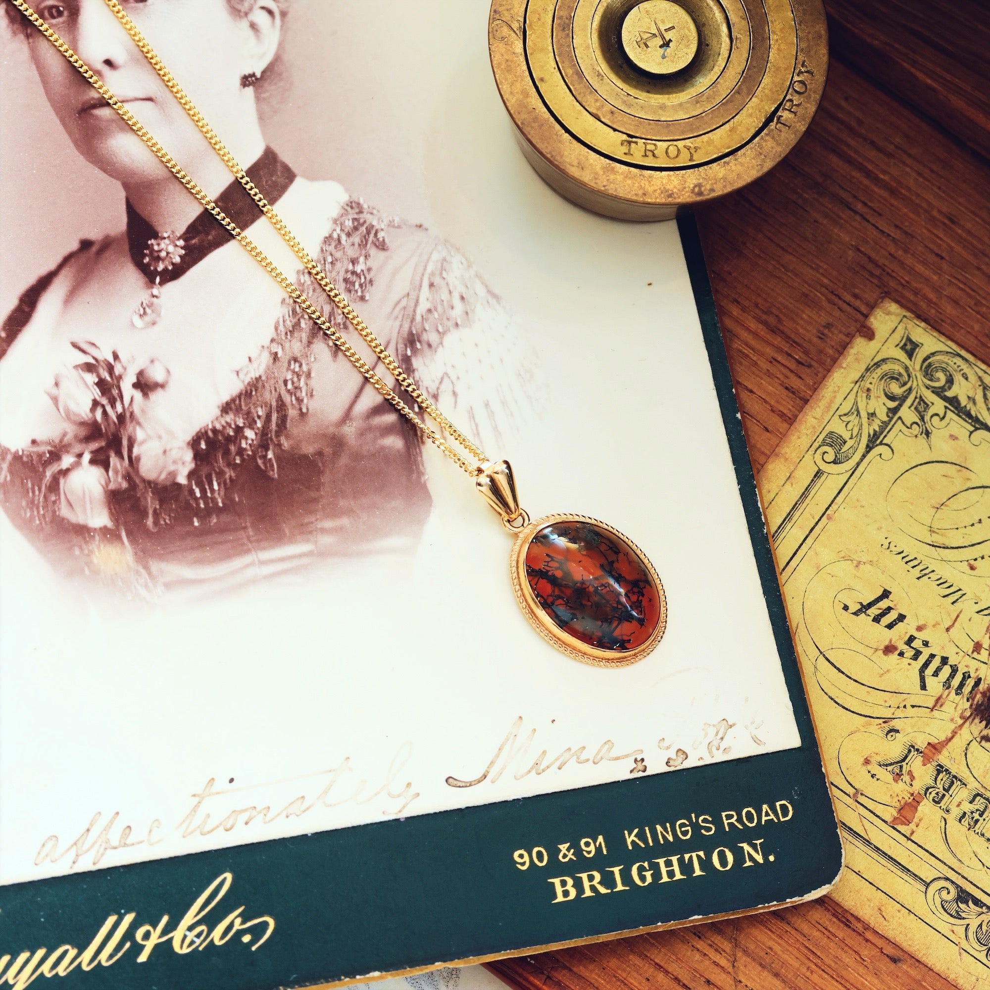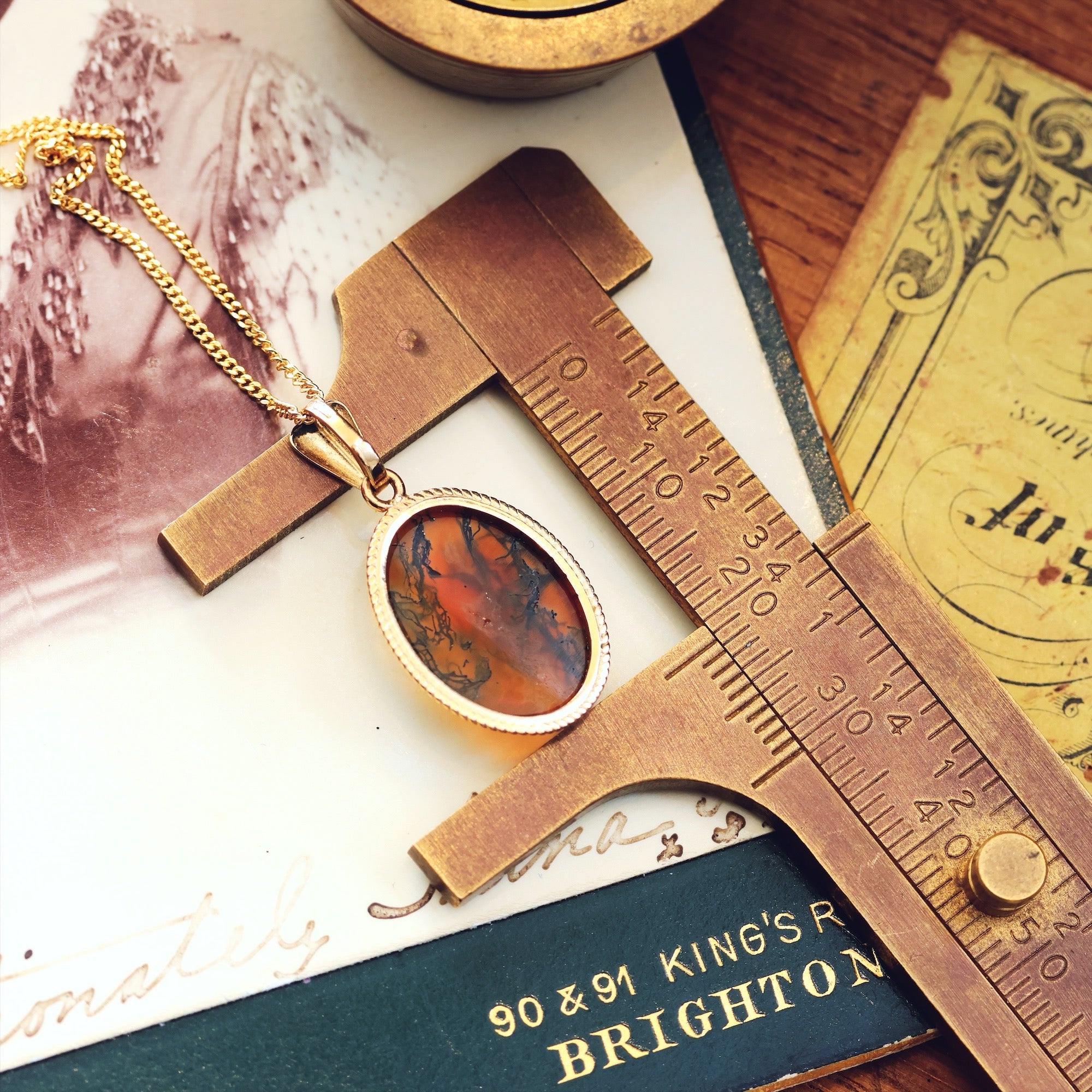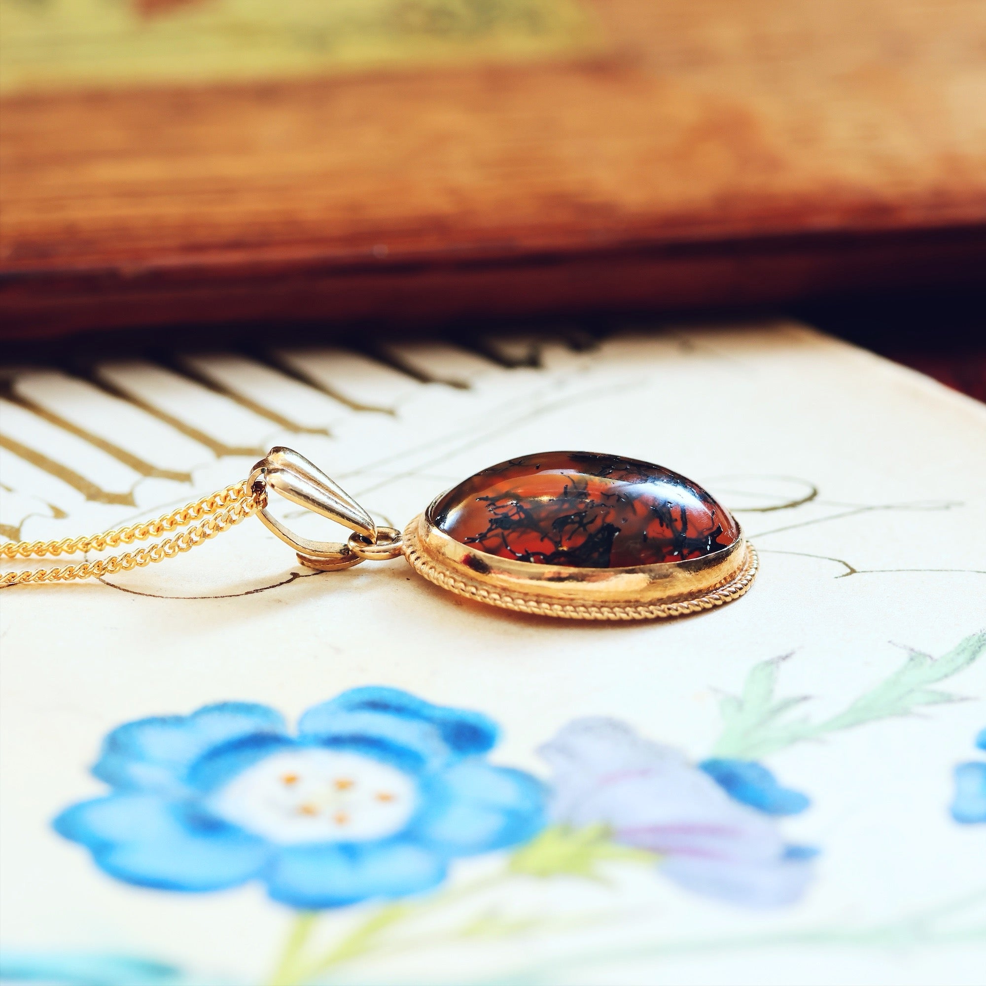 Simply lovely, a vintage natural Moss Agate pendant in a classic style with a rope edging around the cabochon gem which has gorgeous markings in beautiful earthy tones.