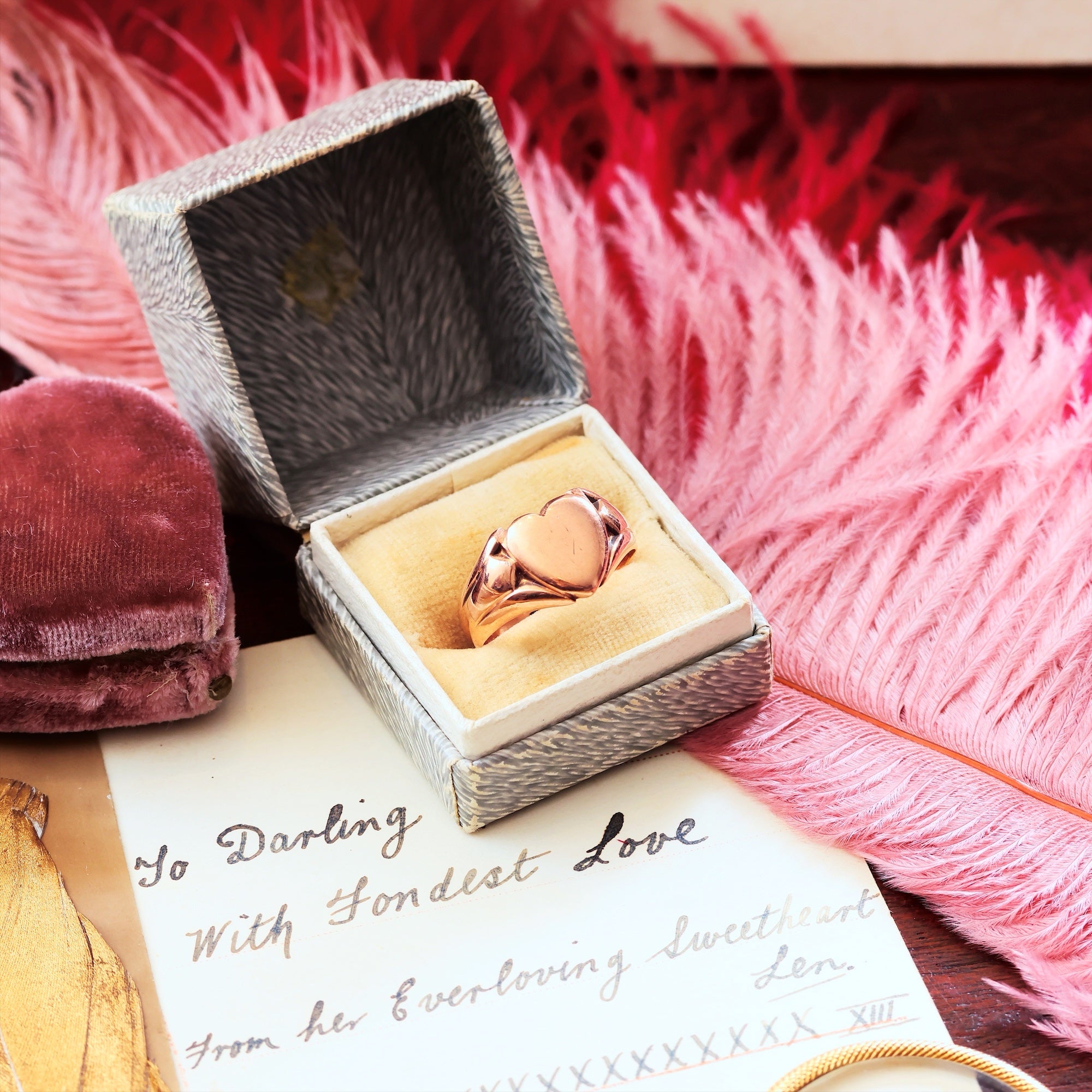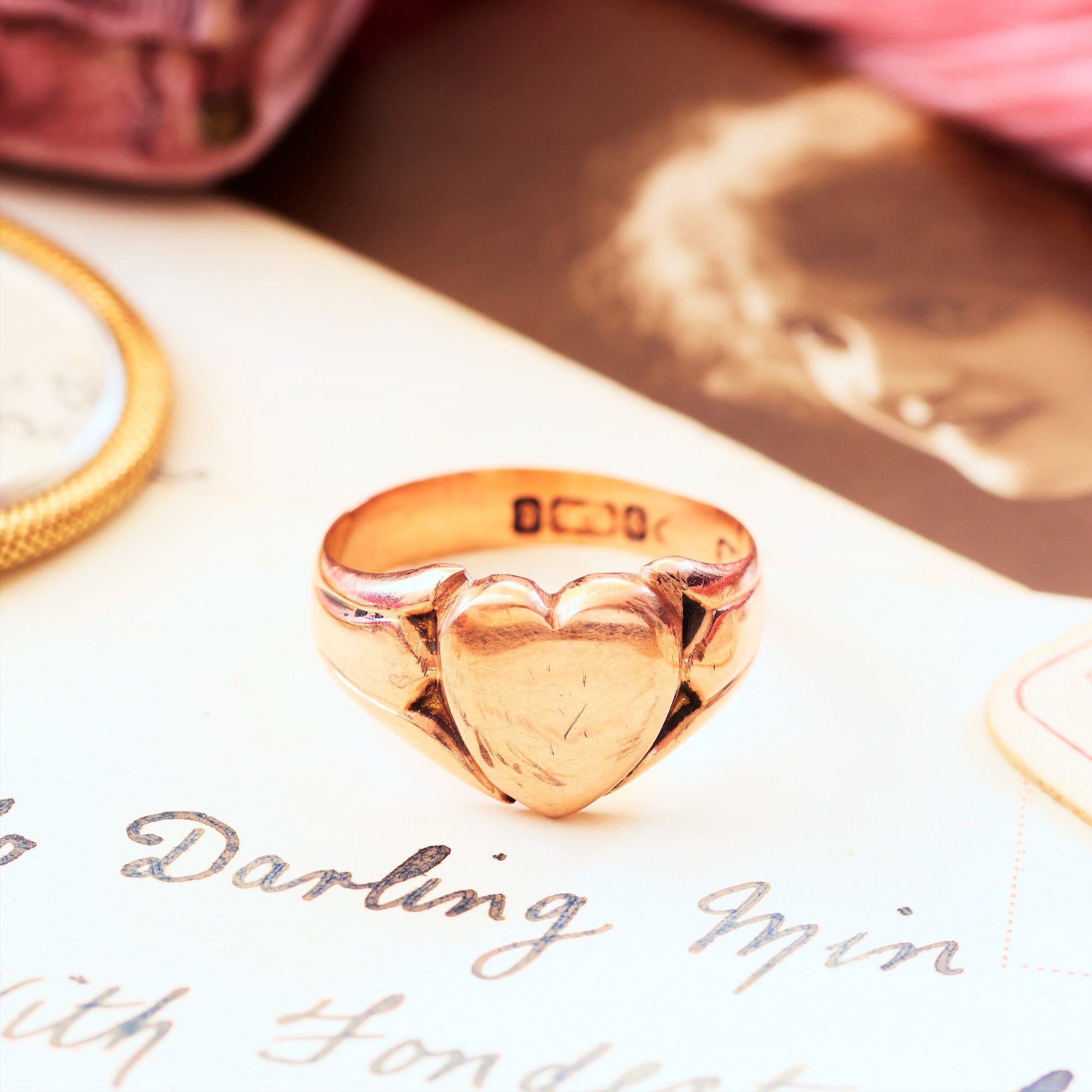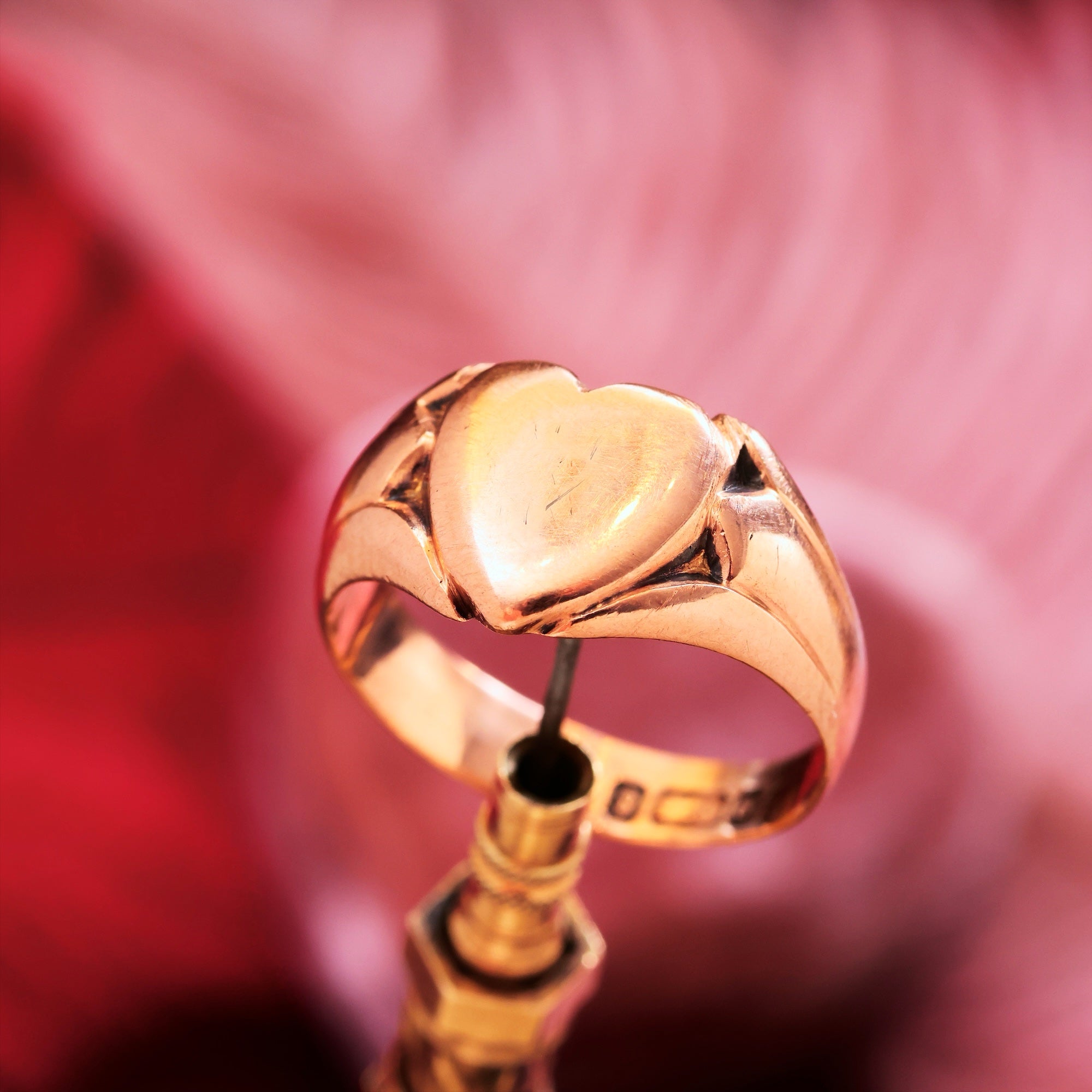 A handsome heart shaped antique 9ct Rose Gold signet ring dating to 1905 with a full hallmark applied at the now closed Chester Assay Office. A gently curved shape which flatters the finger, there are nicely contrasting angled shoulders which resemble somewhat the traditional Irish Claddagh ring. Softly worn, this ring feels familiar on the hand but can be polished more brightly if desired. It would make the most unusual 100% recycled wedding band choice!
