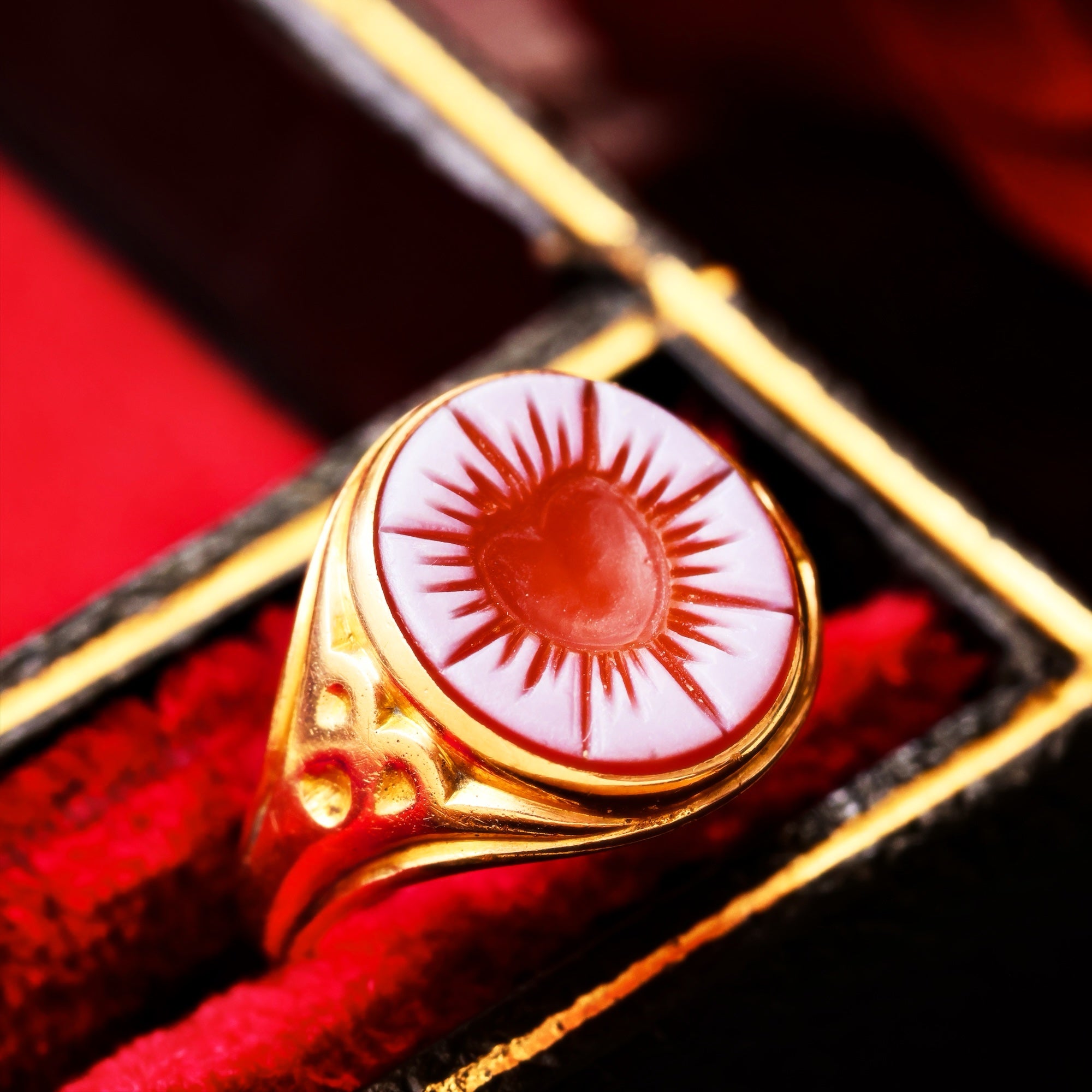 An distinguished antique signet ring in a harmonious oval shape and set with a delicious layered Sardonyx hand carved with an intaglio heart design showing the darker layer contrasted against the pale surface. The intaglio seal can be used to stamp a wax seal onto your personal correspondence, as one did back in the day.