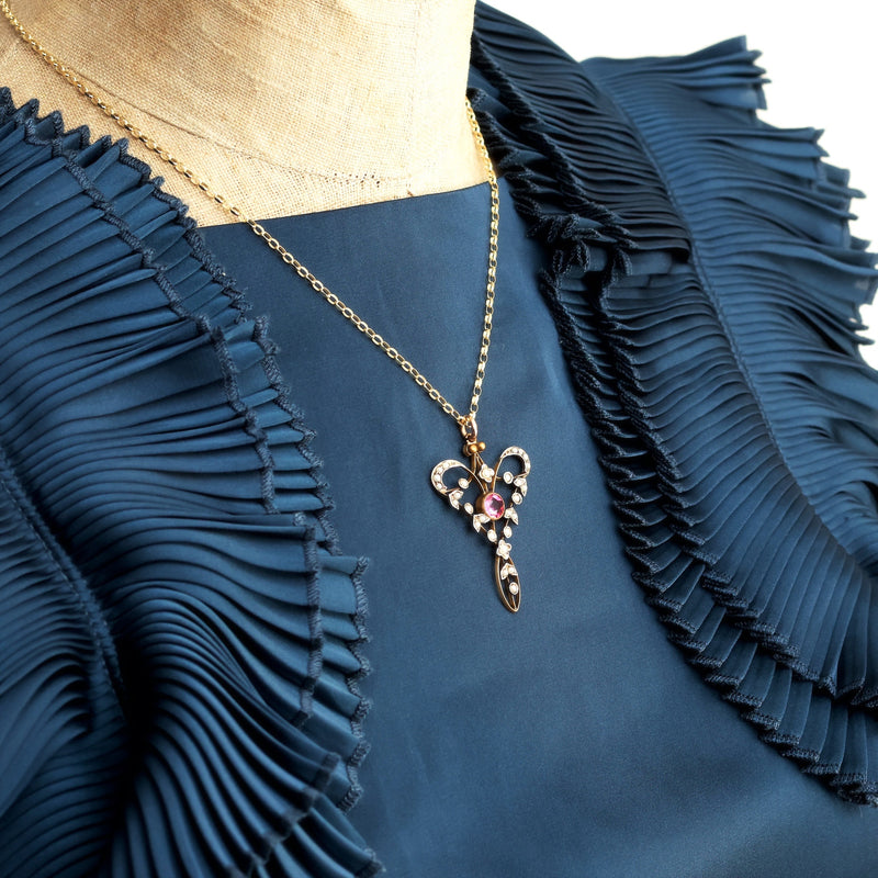 Edwardian Seed Pearl & Pink Paste Pendant & Chain