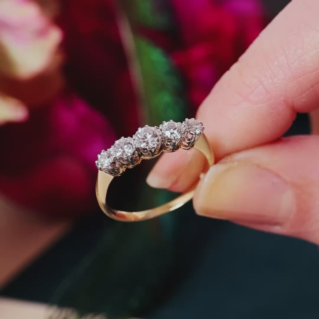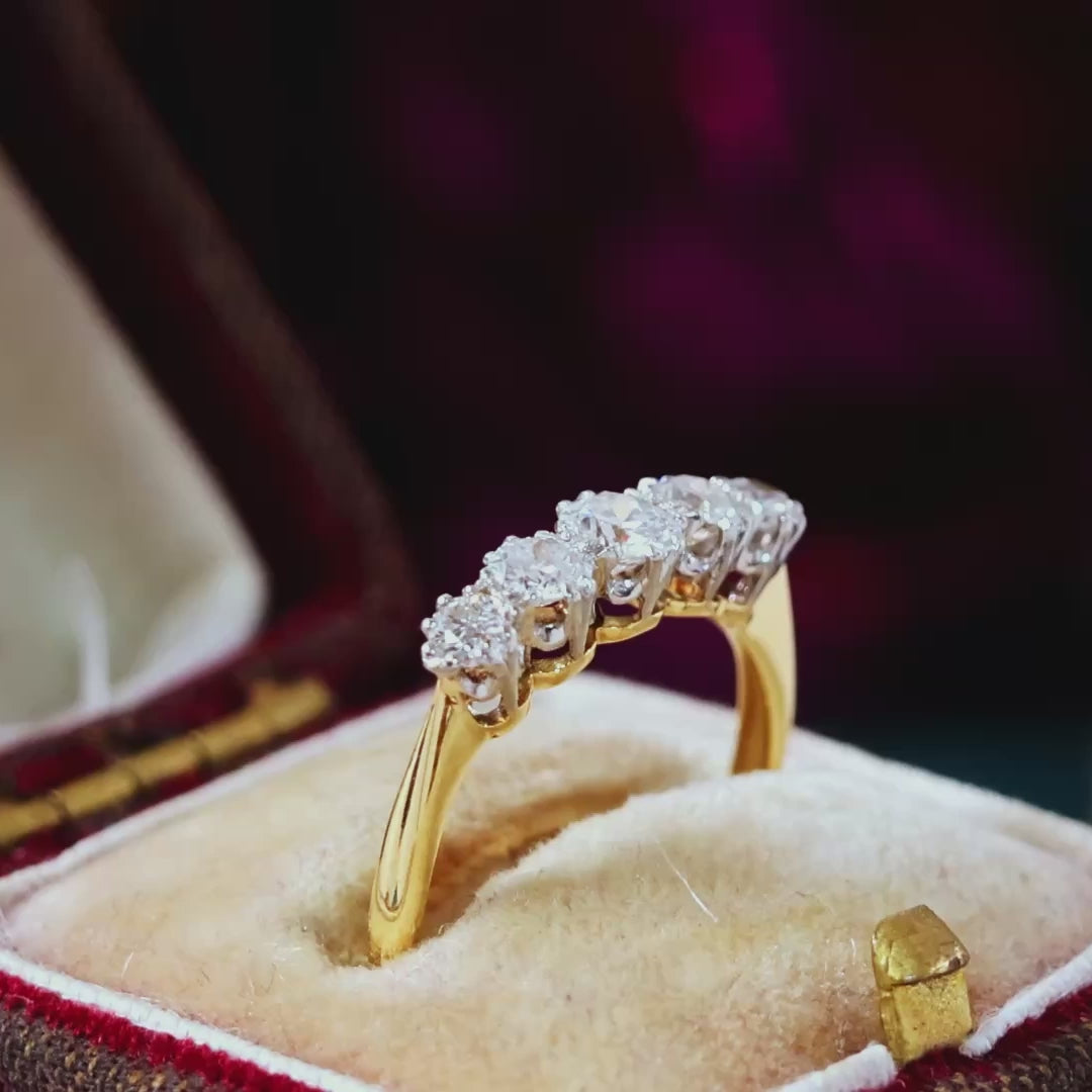 A beautifully glittery vintage five stone Diamond engagement ring in the traditional 'half hoop' made popular in the late Victorian era and a classic favourite ever since! Difficult to place an exact date on her, but as she is entirely hand crafted we would say perhaps the 1920's at earliest. The Diamonds are of superior white and clean quality...everso sparkly and the whole impact is one which will justly garner envious glances!