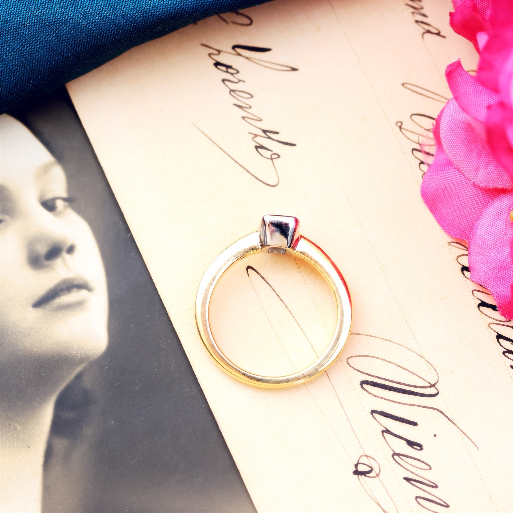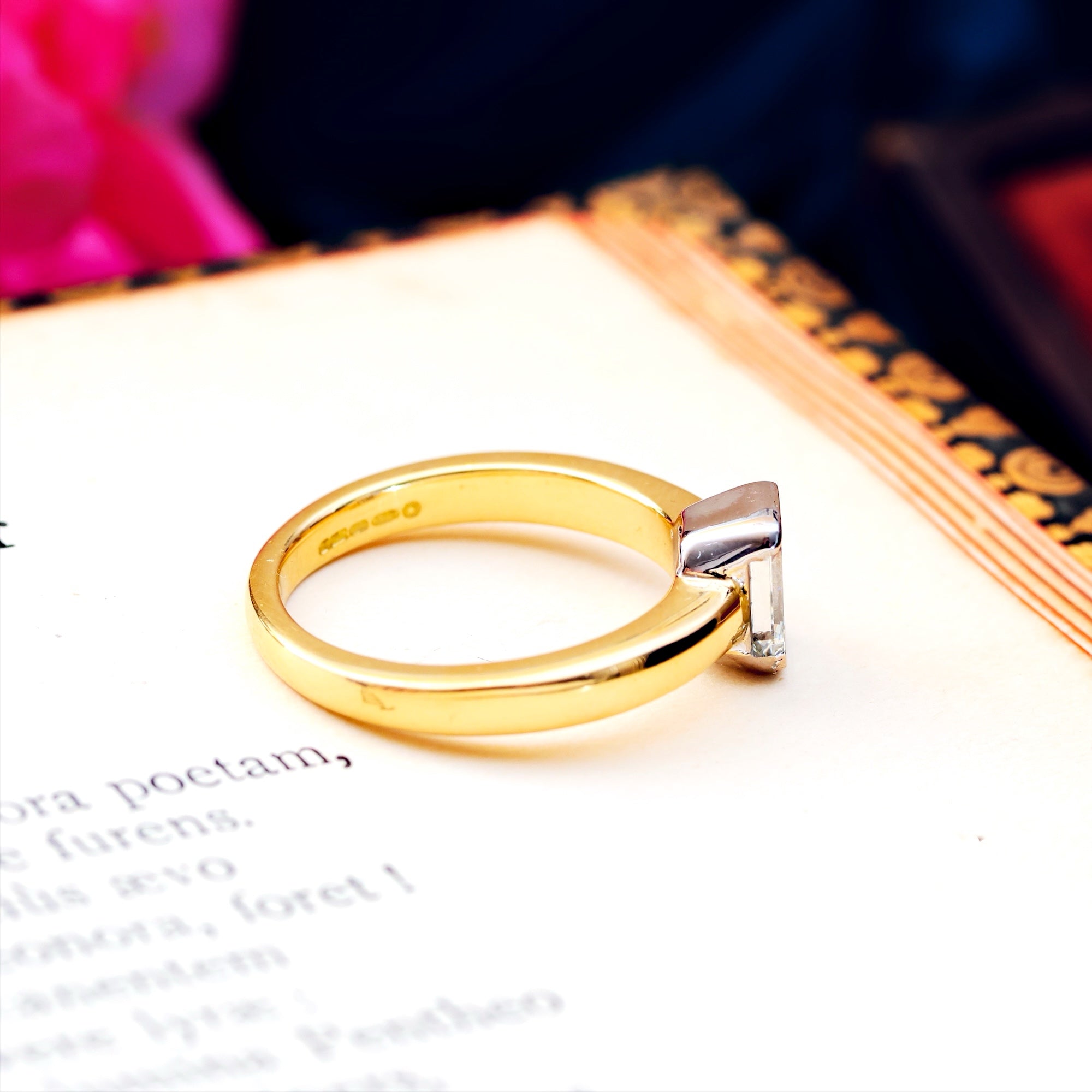 Mounted in nicely weighty 18ct yellow Gold with a bevelled Platinum setting to the gorgeous gem which is minimal and allows the Diamond to shine unhindered.