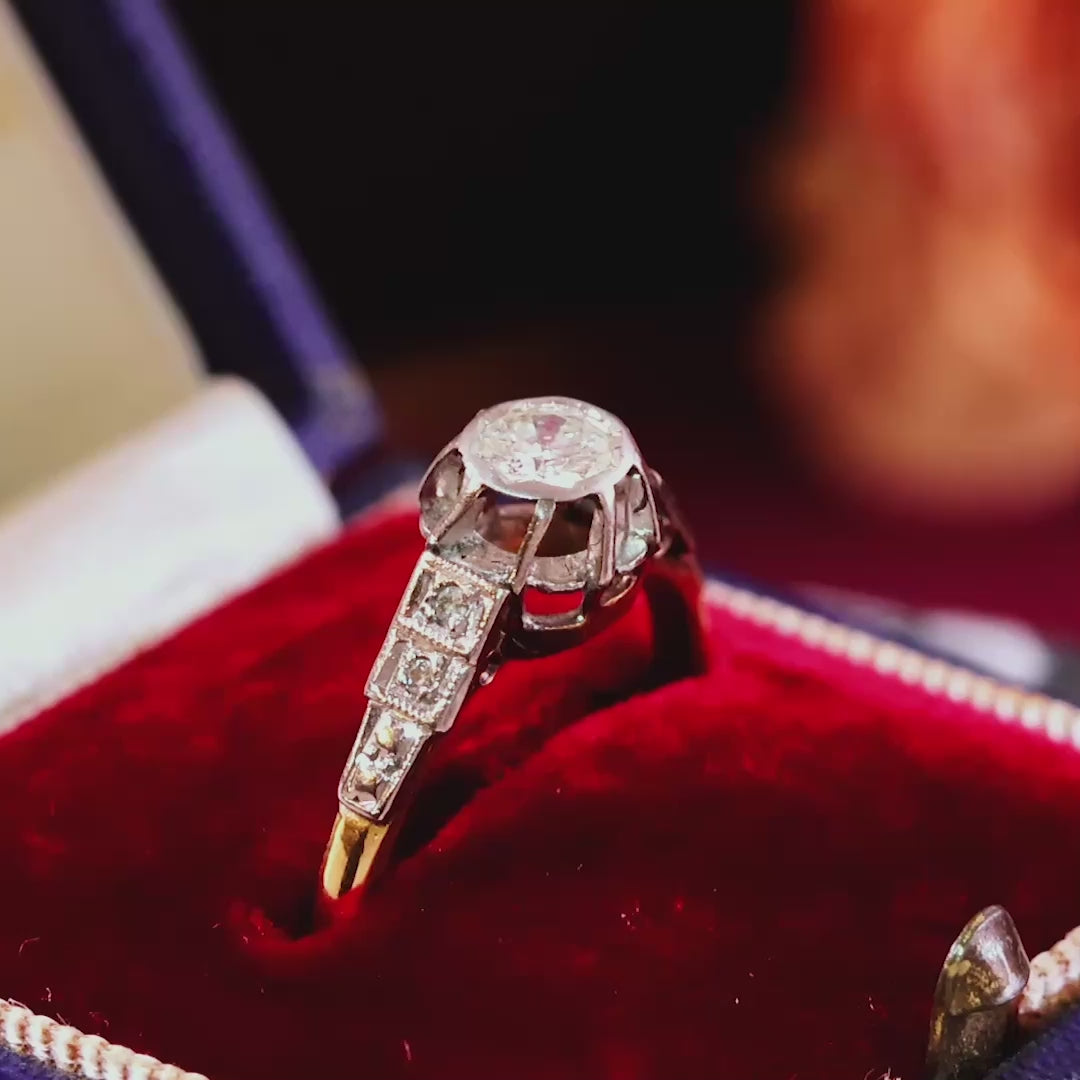A marvellously individual English Art Deco Diamond engagement ring. The very zenith of fashionable at the time, a high platinum 'tulip' style setting to the brilliant-cut Diamond, a flowerbud imagined in a moderne style with accent stones to the shoulders, uniquely lovely! The Diamond weighs 0.31ct, is a super bright white and has a most fabulous glitter.