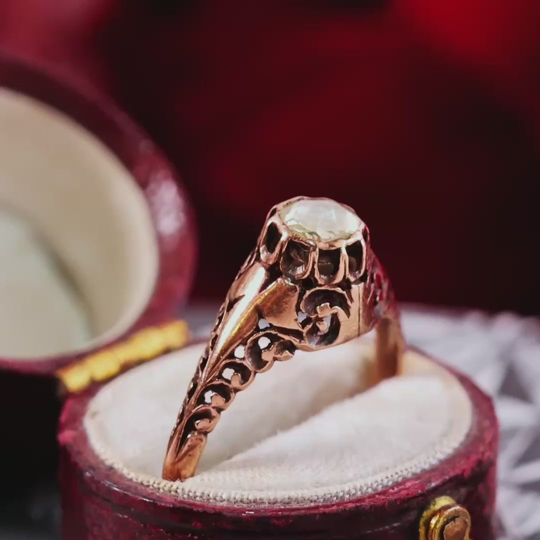 Cleverly crafted from warmly rosy 14ct gold, and strewn with the most ornate pierced out filigree curliques embellished with a soft patina of age, this is an awesome antique Diamond ring. The stone is a foiled rose cut Diamond, quite flat in profile and with some water damage to the foiled backing its sparkle is subdued but this only accentuates the grandeur of the setting. Every aspect crafted by hand, with care and feeling, it fondly hugs the finger and resides there looking most splendid. This piece is a one-off and its new owner will be a lucky lady indeed.