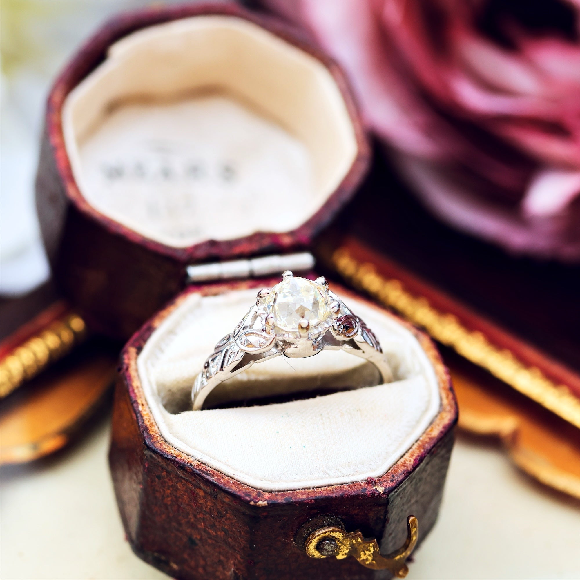 An adorable vintage Diamond solitaire engagement ring in the classic style made famous by Tiffany in the late 19th century, although this example likely dates to the 1920's/30's. All hand crafted in Platinum to a slender model with tiny hand engraved leafesque ornamentation to each shoulder, the beautiful old hand cut Diamond has been weighed at 0.82ct and we can say is very lovely indeed.