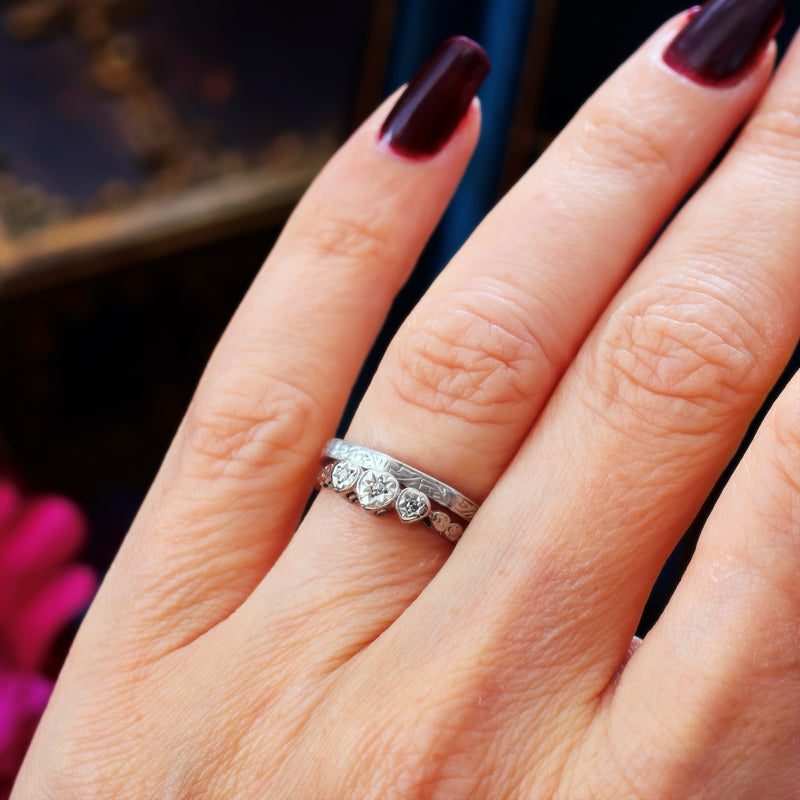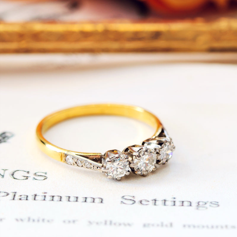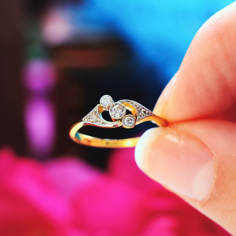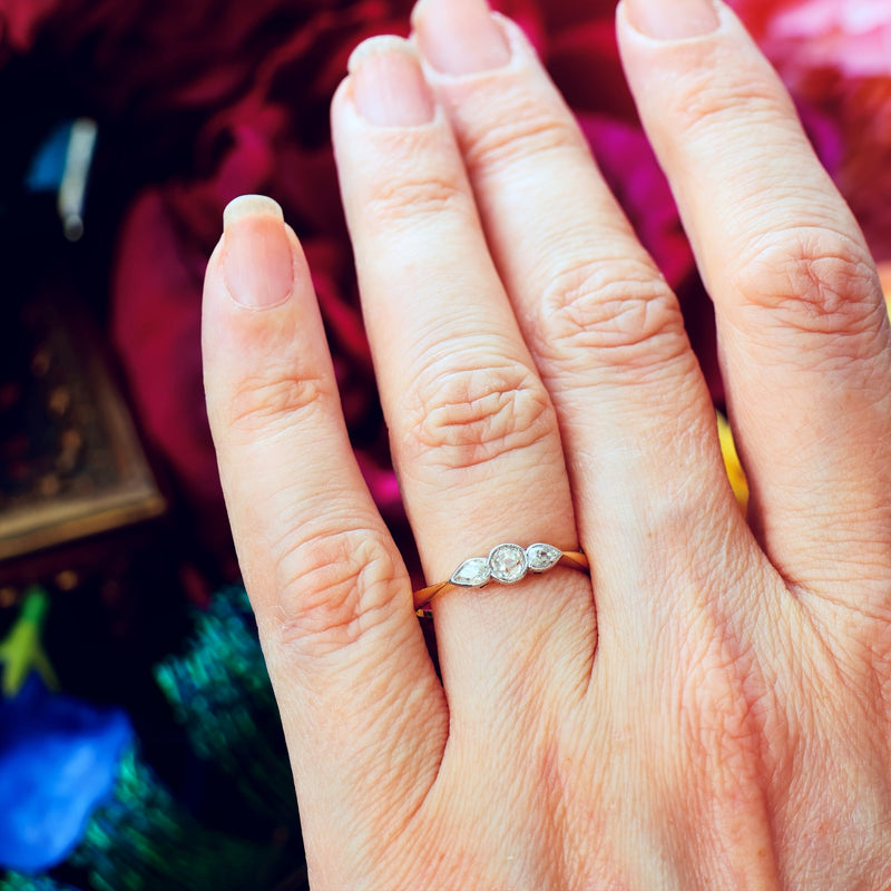 Antique and vintage Trilogy Diamond and Gemstone rings, a classic and timeless design. Whether for an engagement or anniversary, these rings always have that special significance. We look out for antique (therefore recycled and ethically sound) hand-cut Diamonds and hand crafted details which give that feeling of quality and care to a ring. All of our trilogy rings can be viewed in our shop in Brighton Lanes and sized to fit (for free) in an hour-ish.