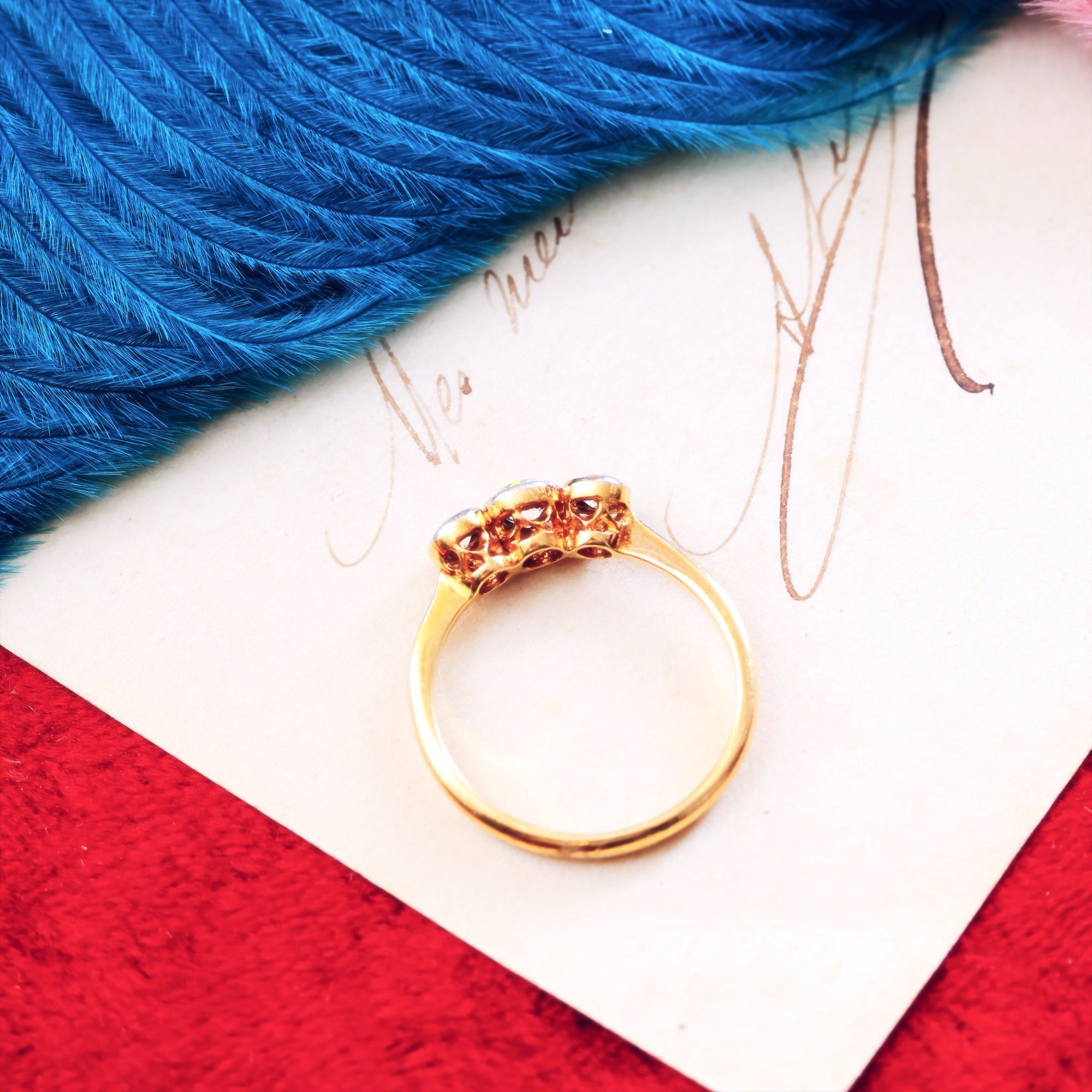It shows all the design aspects which were so beloved of the time; a crispness to the slender milgrained Platinum setting around each of the fizzy (and pure icy white) old hand cut Diamonds; a neat hand sawn gallery of rich 18ct yellow Gold sits beneath each and the shoulders are finely tapered to meet the band. A true delight and in wonderful condition... ready for a new romance!