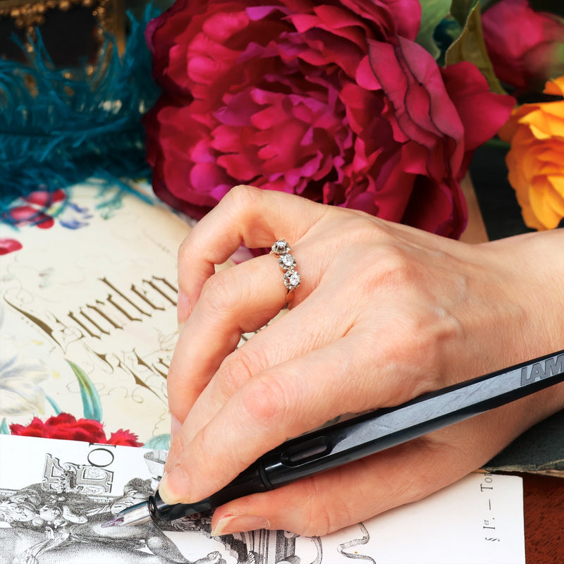 Antique and vintage Trilogy Diamond and Gemstone rings, a classic and timeless design. Whether for an engagement or anniversary, these rings always have that special significance. We look out for antique (therefore recycled and ethically sound) hand-cut Diamonds and hand crafted details which give that feeling of quality and care to a ring. All of our trilogy rings can be viewed in our shop in Brighton Lanes and sized to fit (for free) in an hour-ish.