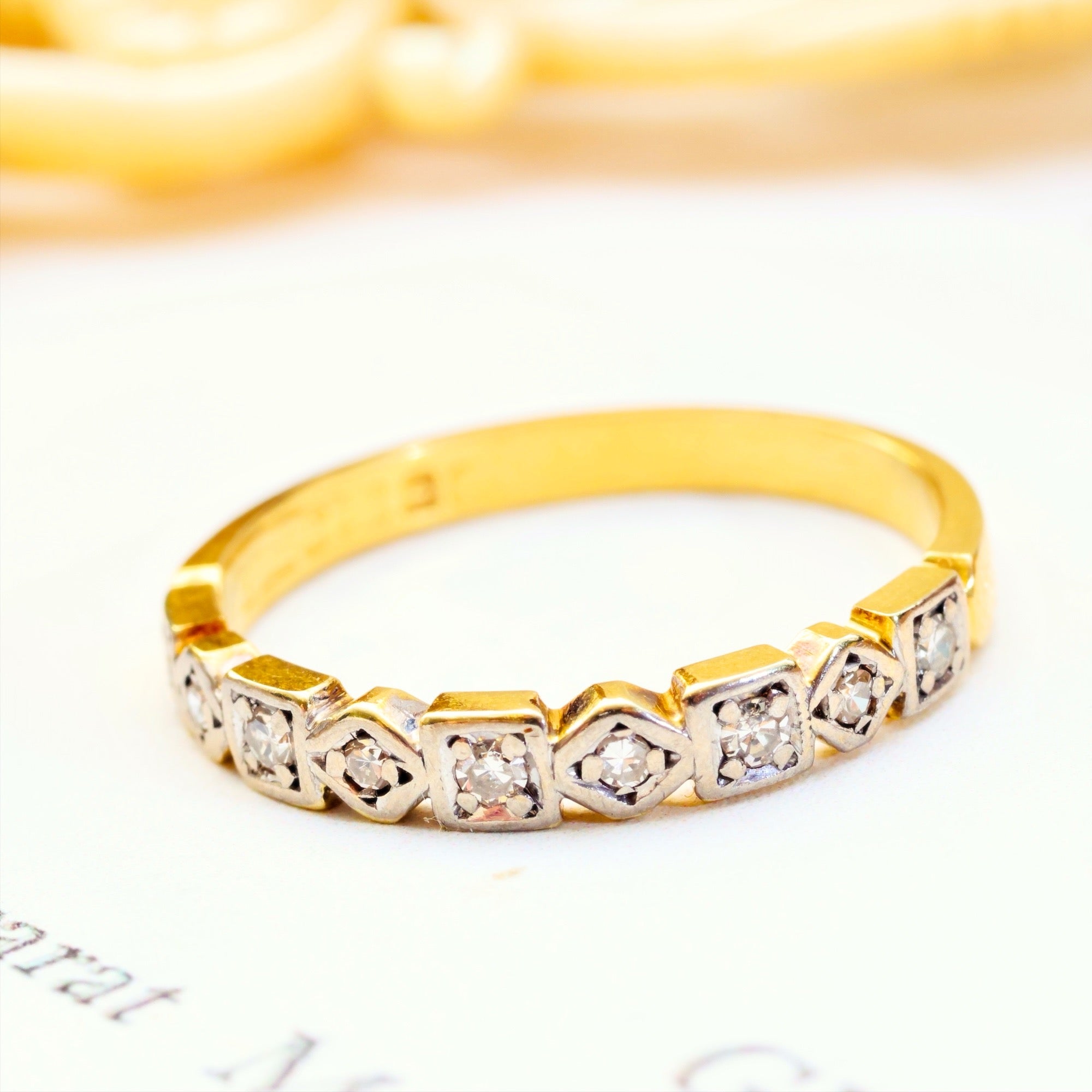 A very pretty and nice quality vintage Diamond half eternity style band, the perfect sparkly partner to a vintage engagement ring. Crafted in 18ct yellow Gold with a fine shaped Platinum setting to the Diamonds , the profile is neat and low to the finger for comfort and pleasing symmetry. Each of the eight small Diamonds is cut in the simple 'eight-cut' manner with as many facets to the pavilion.