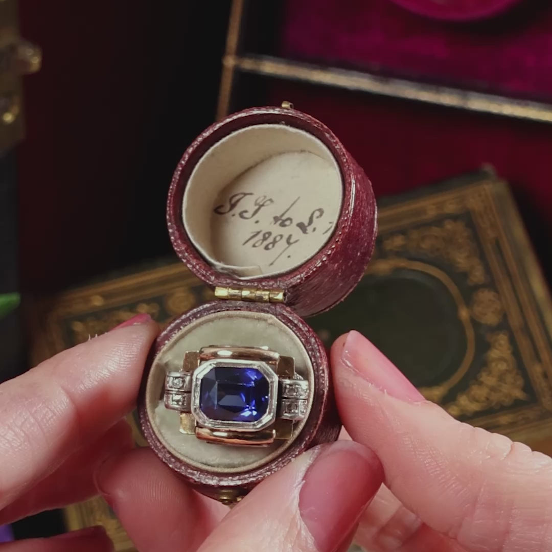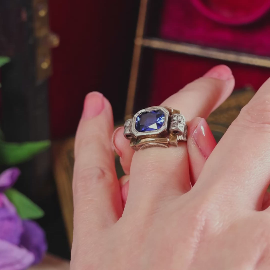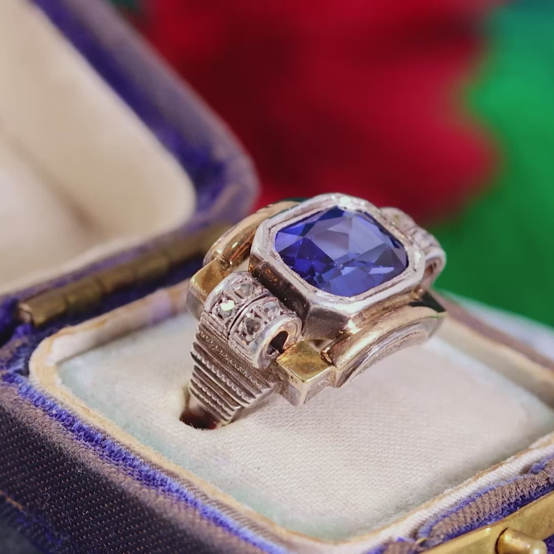 A luscious vintage Continental Art Deco dress ring designed around an ideal deep blue synthetic Sapphire (created by the flame fusion process in a laboratory). Read more about this process here. All original and dating to the 1940's/50's, the fabulous gemstone is accented by tiny old hand faceted rose-cut Diamonds set to the Odeon styled Silver shoulders which themselves are further ornamented by hand engraving to the side view. Hand crafted and with great imagination and verve to express the excitement of the Jazz Age.