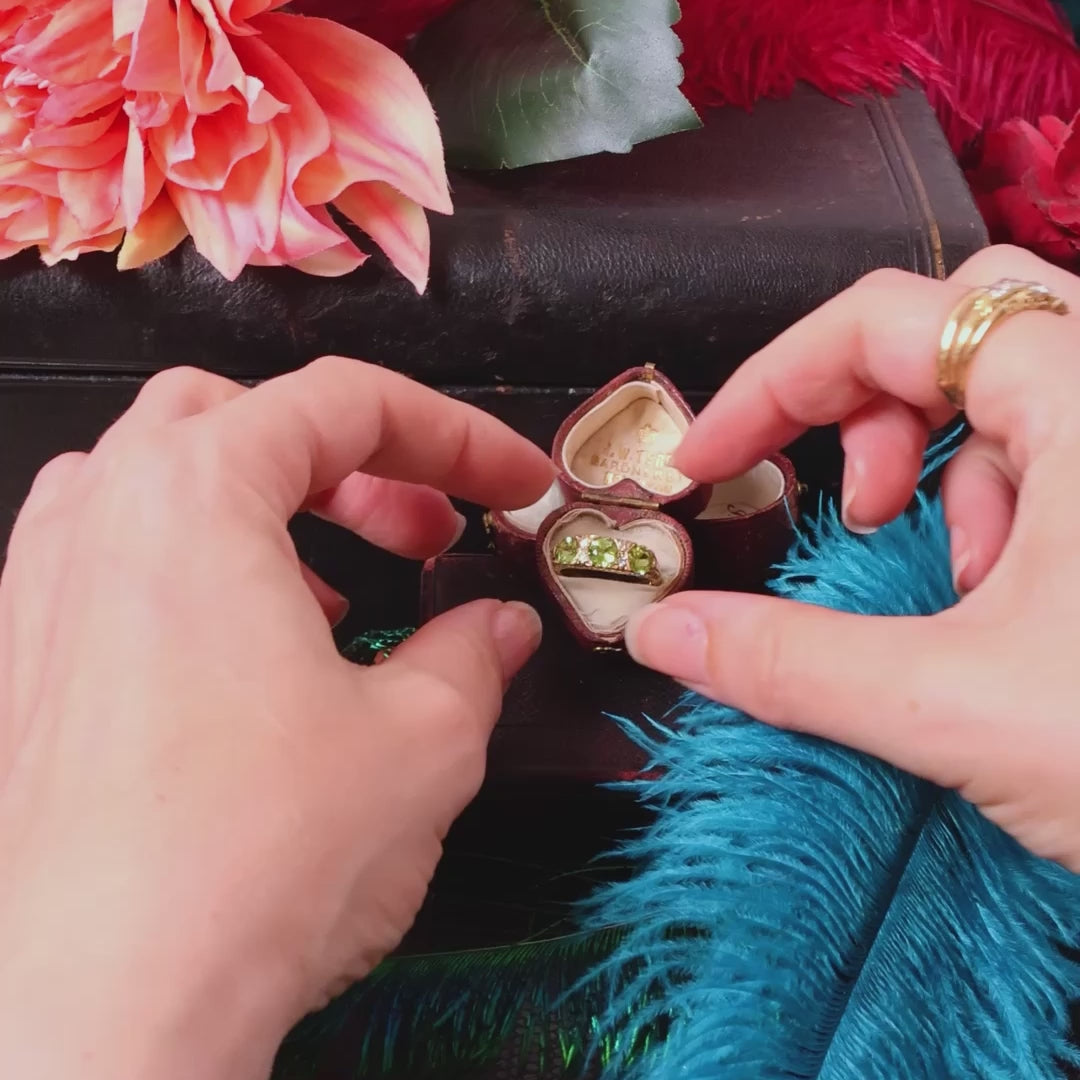 A delicious vintage Victorian style carved half hoop ring set with fabulous apple-y green Peridots accented by twinkly Diamonds between. Dating to the 1960's or so and in lovely quality 18ct yellow Gold which is marked inside the band. An unusual choice of gems; we have had the Peridots re-polished by our lapidary to bring back the beautiful sparkle to the gems. Supernice!